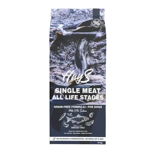 Une alimentation sèche délicieuse sans céréales de 12 kg de la marque Hays pour le chien adulte. Ces croquettes sont préparées avec une mono protéine de saumon. La recette est dotée également d’extraits de plantes et de fruits pour un goût succulent. Cette formulation booste les défenses immunitaires et empêchent les bactéries pathogènes de se fixer sur la paroi intestinale. Les prébiotiques permettent de rééquilibrer la flore intestinale. Le chien adulte bénéficie d’une protection des articulations grâce au sulfate de glucosamine et à la chondroïtine qui assure l’élasticité et la solidité du cartilage. Une nutrition complète idéale pour le chien adulte souffrant d’une intolérance alimentaire.